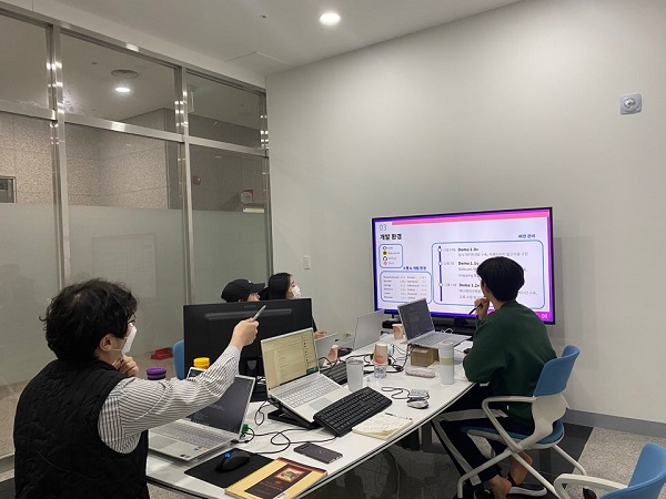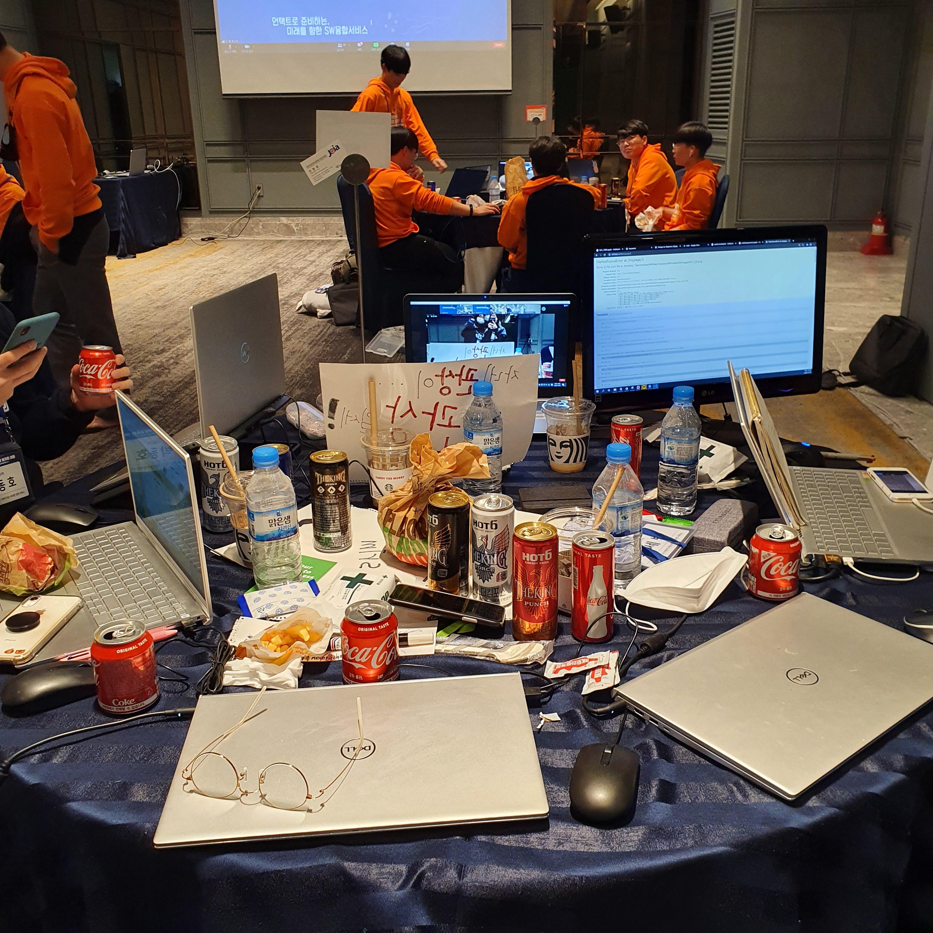 들어가면 앞에서 본인 확인 절차를 거치고 해커톤 단체 후드티와 간단한 세면 도구 등을 받고 각 팀별로 테이블이 설치 되어있어서 거기서 진행하면 된다. 각 테이블마다 중앙 서버와 ZOOM으로 연결되어있는 컴퓨터가 한 대 있고, 캠 화면에 팀원이 1~2명은 꼭 나와있어야 한다. 코시국이라 이렇게 비대면으로 진행된 것 같다. 차후 발표도 ZOOM으로 화면공유해서 진행한다.