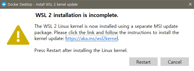 docker desktop이 실행되면서 다음과 같이 wsl 2 installation is incomplete. 라는 메세지를 뱉었다.