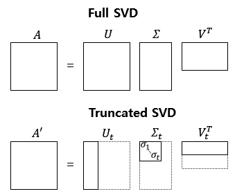절단을 하면 대각 행렬 $\Sigma$의 원소의 값 중에서 상위값 $t$개만 남게 된다. 절단된 SVD를 수행하면 값의 손실이 일어난다. 왜 절단된 것을 사용하는가? 노이즈에 영향을 받을 수 있기 때문이다. 그래서 $t$를 하이퍼파라미터로 사용한다. 결과적으로 $t$를 크게 잡으면 기존 행렬 A로 부터 다양한 의미를 가져갈 수 있지만, $t$를 작게 잡아야 노이즈를 제거할 수 있다. 게다가 차원이 줄어들어 계산 비용 또한 낮아진다.