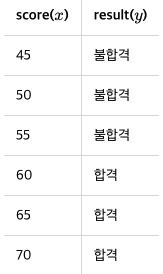 학생들이 시험 성적에 따라 합격, 불합격이 기재된 데이터가 있다고 가정해보자. 시험 성적이 x라면 합불 결과는 y다. 이 시험의 커트라인은 공개되지 않았는데 이 데이터로부터 특정 점수를 얻었을 때의 합격, 불합격 여부를 판정하는 모델을 만든다고 하자.