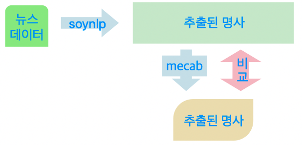 그래서 떠오른 아이디어는 뉴스데이터를 크롤링하여 soynlp의 명사추출기로 추출된 명사를 10개씩 ' '(공백)으로 이어 붙여 형태소 분석기(사용한 것은 mecab)을 통해 명사 분석한다. mecab을 통해 나온 output을 input으로 넣었던 명사와 비교하여 분석되지 않은 명사가 어떤 것인지 살펴보는 것이다!